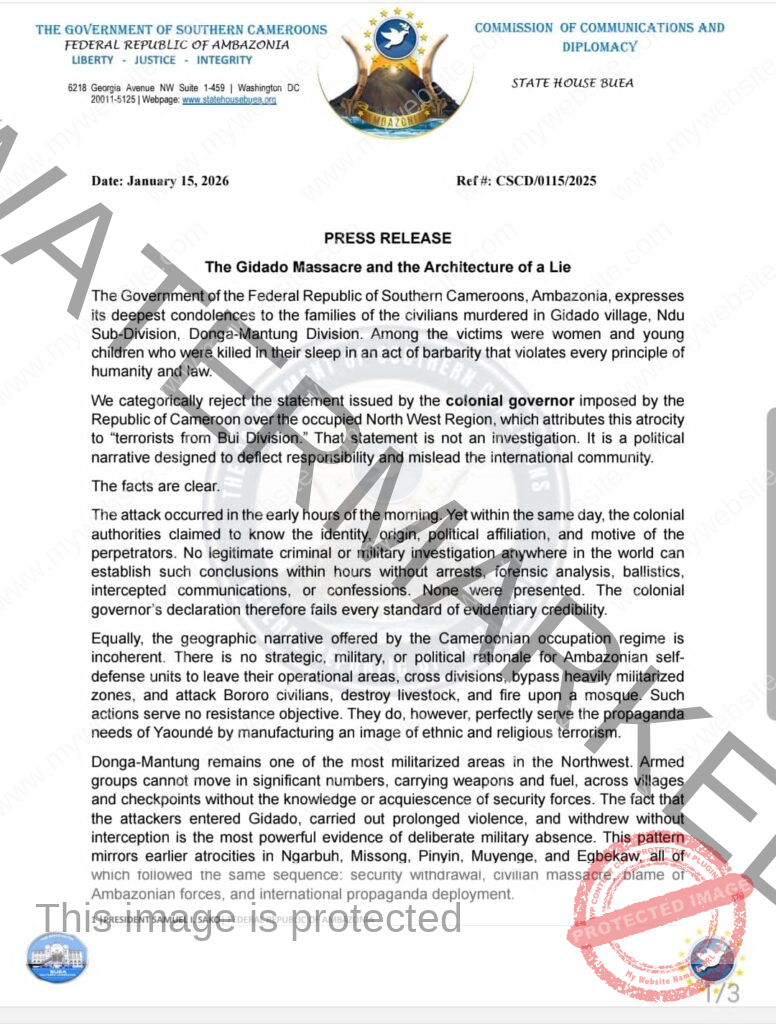 Communique The Government of the Federal Republic of Ambazonia responds to the Colonial Governor on his outing on the killings of Mbororo in Gidado By Independentist News January 17, 2026 0 Comments Less than a minute 170 Views 4 weeks ago Facebook Twitter LinkedIn Pinterest Whatsapp Print Share via Email Tiktok 73 Share Facebook 0 Share WhatsApp